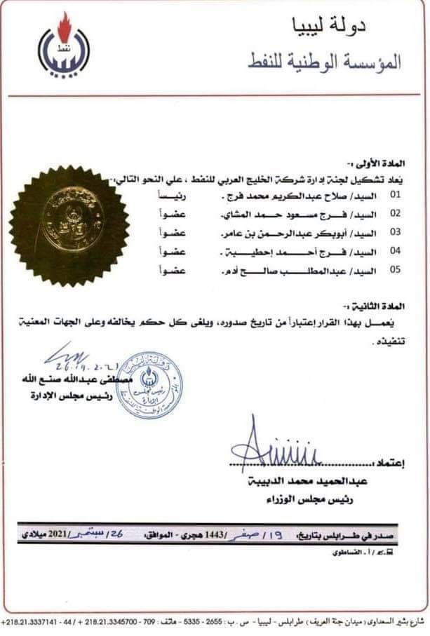 كما نص القرار على أن يتم التنسيق مع رئيس لجنة الإدارة السابق لإتمام عملية التسليم والإستلام وذلك يوم الأربعاء 29 سبتمبر 2021، وتم كذلك تكليف كلاً من خيرالله صالح عبدالسلام، خالد عبدالهادي الخفيفي، أبوبكر فرج الهوني؛ وذلك لحضور وإتمام عملية التسليم والإستلام وتوثيقها بمحضر وإحالته إلى رئيس مجلس ادارة المؤسسة الوطنية للنفط للإعتماد.