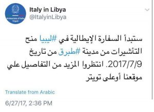أعلنت السفارة الايطالية في ليبيا عن افتتاح مكتب لإصدار التأشيرات في مدينة طبرق إبتداءاً من يوم الأحد الموافق 9/7/2017