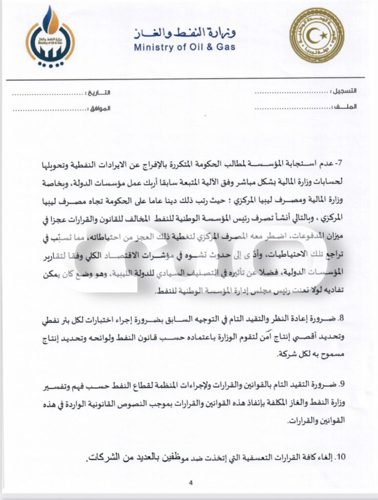 وإلغاء كافة القرارات التعسفية التي إتخذت ضد موظفين بالعديد من الشركات وضـرورة الرد على كـافـة المراسـلات التي تم توجيهها للمؤسـسـة منذ 2021 / 03 / 15 م بداية من المعلومات المطلوبة على مختلف القرارات التي صـدرت من مجلس إدارة المؤسسة الوطنية للنفط ، وضـرورة إلغاء التوجيه للشـركات بعدم التعامل مع الوزارة وملاحظة أن الوزارة لديها كافة الصلاحيات للتعامل المباشر وغير مع الشركات النفطية والجهات التي تتبع المؤسسة وملاحظة المادة ( 151 ) من قانون العمل .