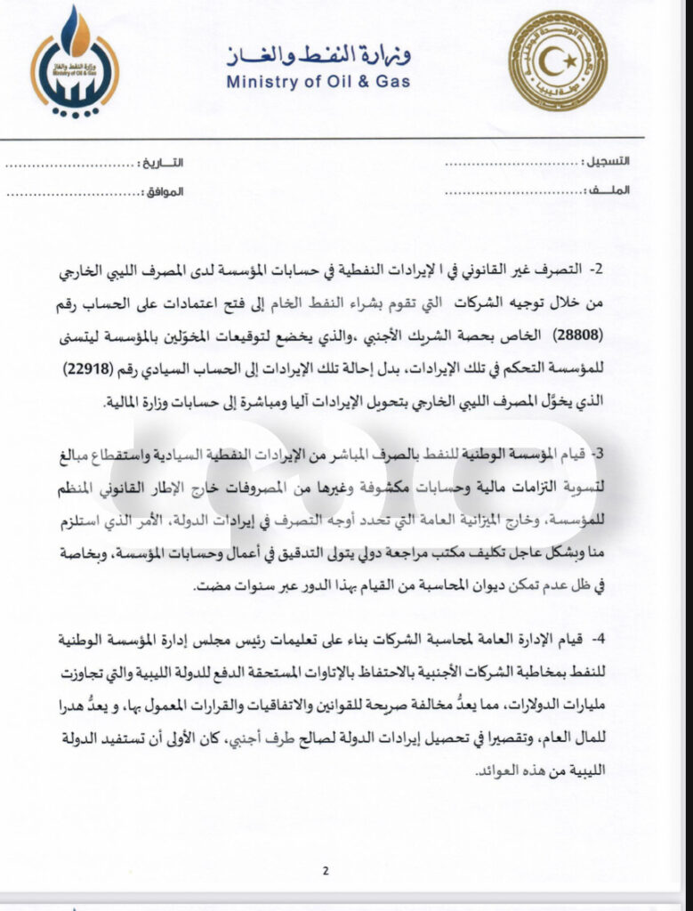 وقال؛ لاحظنا إستمرار حجب الإيرادات النفطية الموردة لحسابات مؤسسة النفط لدى المصرف الليبي الخارجي والامتناع من توريدها لحسابات وزارة المالية ، بالمخالفة للقانون المالي للدولة ولكتاب رئيس مجلس الوزراء الذي طالب بموجبه تحويل الإيرادات النفطية لدى المصرف الخارجي إلى حسابات وزارة المالية وطلب العودة في تحويل الإيرادات النفطية إلى الآلية المتبعة سابقاً .
