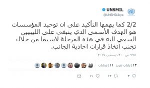 وأكدت البعثة عبر حسابها الرسمي على موقع التواصل الاجتماعي “تويتر” على أن الهدف الأسمى الذي يجب على الليبيين السعي إليه في هذه المرحلة هو توحيد المؤسسات، لكن ذلك لا يكون إلا بتجنب اتخاذ قرارات أحادية الجانب والالتزام بمواد الاتفاق السياسي.