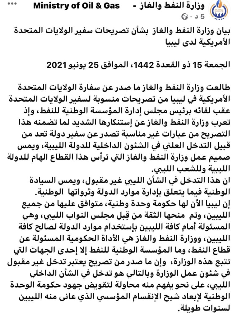 بعد تحدثه عن كفاءة المؤسسة والإشارة إليها..وزارة النفط تصدر بياناً لإستنكار ما ورد في حديث السفير الأمريكي لدى ليبيا