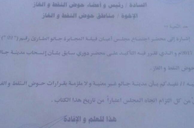 أعلن مجلس أعيان قبيلة المجابرة اليوم الاثنين الموافق 4 ديسمبر عن انسحابه من حوض النفط والغاز.