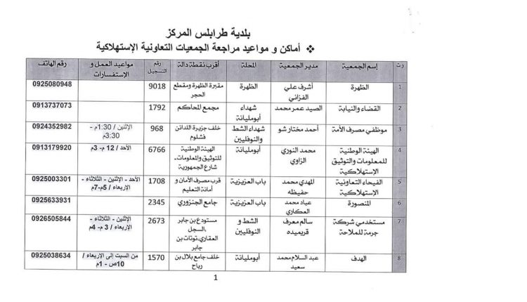 اعلنت بلدية طرابلس الامس على صفحتها على موقع التواصل الاجتماعي فيس بوك ،عن اماكن و مواعيد مراجعة الجمعيات الاستهلاكية ، في جداول اوضحت فيها البلدية اسم الجمعية و موقعها بالاضافة الى اسم المدير و رقم التسجيل و رقم الهاتف .