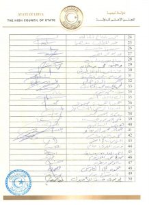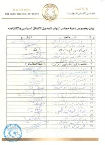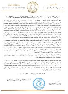 أصدر أعضاء المجلس الأعلى للدولة بيانًا دعوا فيه مجلس النواب الليبي لتوحيد الجهود وتنسيق المواقف والعمل على تجاوز المصاعب التي تعيق تنفيذ وتحقيق أهداف الاتفاق السياسي، وفي مقدمتها إعادة هيكلة السلطة التنفيذية والعمل على توفير الظروف الملائمة لإنجاز الاستحقاق الدستوري والانتخابي