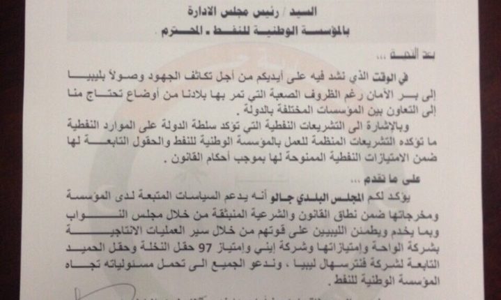 أكدت بلدية جالو في بيان لها يوم الأربعاء الموافق الأول من نوفمبر دعمها للسياسة المتبعة من قِبل المؤسسة الوطنية للنفط ورئيسها المهندس مصطفى صنع الله، في النهج المتبع لسير العملية الإنتاجية النفطية في ليبيا.