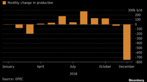 انخفض إنتاج أوبك من النفط بأكبر درجة في عامين بسبب التخفيضات المبكرة للمملكة العربية السعودية ، وقد وصل هذا الانخفاض إلى 751 ألف برميل في اليوم في ديسمبر ، حيث بدأت المملكة العربية السعودية بداية مبكرة بتخفيض الإنتاج بمقدار 468 ألف برميل في اليوم ، مما ساعد على رؤية إنتاج النفط بسهولة فيما يعد أكبر انخفاض في الكتلة منذ جولة التخفيضات في أوائل عام 2017.
