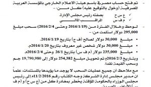 ولاحظ ديوان المحاسبة الليبي بأنه وبتاريخ 3/2/2016 تم تحويل مبلغ 254،382 دولار إلى العملة المصرية، وقدر الديوان المبلغ بنحو 19،790،980 جنيه مصري، وقد تم سحب القيمة نقداً مشيراً بأن جميع عمليات السحب لا يوجد ما يؤيدها بالمستندات، كما أشار إلى أن مدير مجلس إدارة شركة “الساعة” قد أخطر رئيس مجلس الوزراء بالحكومة المؤقتة بمغادرة ” ع س ح ” و ” م ف س” للأراضي المصرية ”