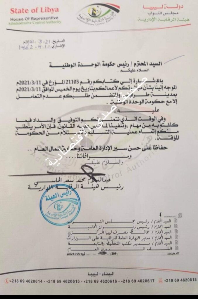 تحصلت صدى الاقتصادية حصرياً على رد رئيس هيئة الرقابة الإدارية التابعة لمجلس النواب بطبرق عبد السلام الحاسي إلى رئيس حكومة الوحدة الوطنية بخصوص طلب الدبيبة بعدم التعامل إلا مع حكومته.