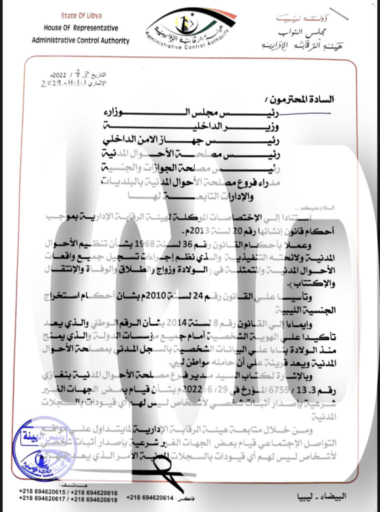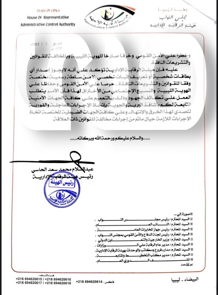 خاص.. “الحاسي” يوجه مراسلة هامة لقيام بعض الجهات بإصدار إثبات شخصي لأشخاص ليسو ليبيين .. وهذه التفاصيل