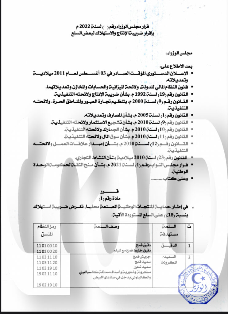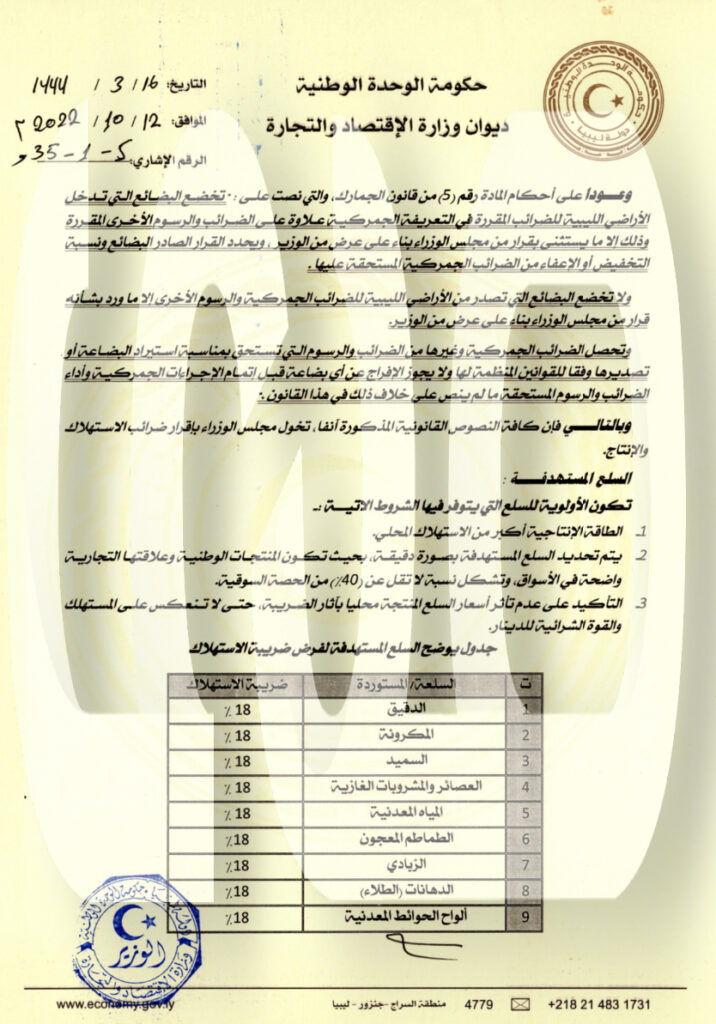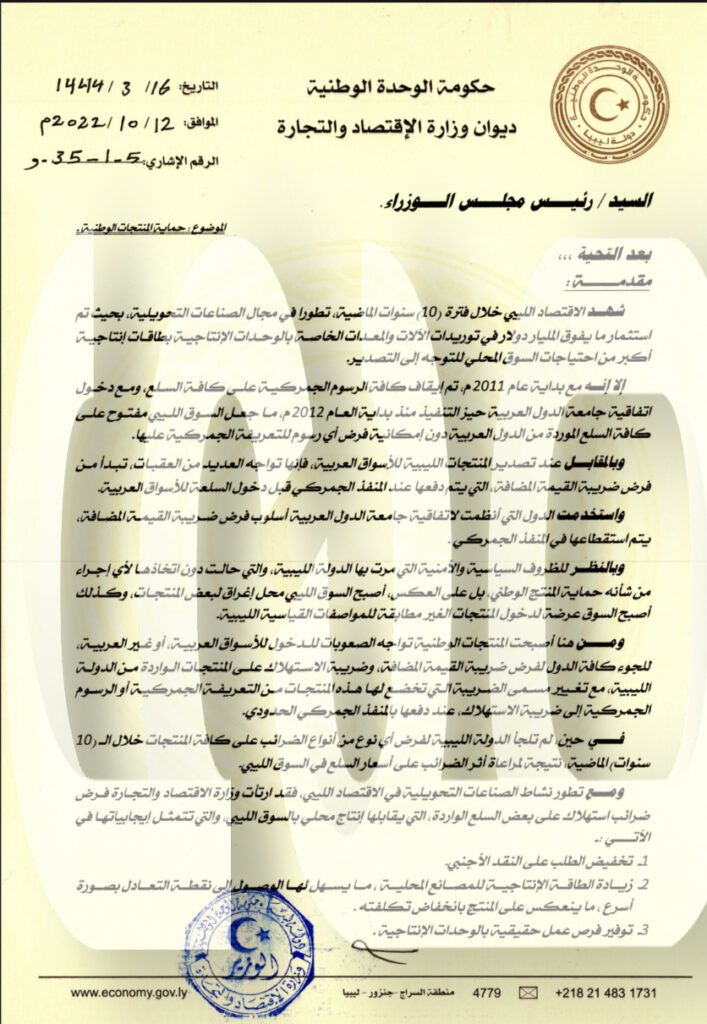 تحصلت صحيفة صدى الاقتصادية حصرياً على مراسلة وزير الاقتصاد والتجارة “محمد الحويج” الموجهة إلى رئيس حكومة الوحدة الوطنية وتتضمن إقتراحه إقرار ضريبة الإنتاج والإستهلاك لبعض السلع .