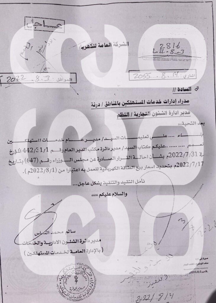 والتي تحوي تعميماً لكتاب مدير دائرة مكتب المدير العام بشأن إحالة قرار مجلس الوزراء بتحديد أسعار الطاقة الكهربائية للعمل به اعتباراً من 1/8/2022.