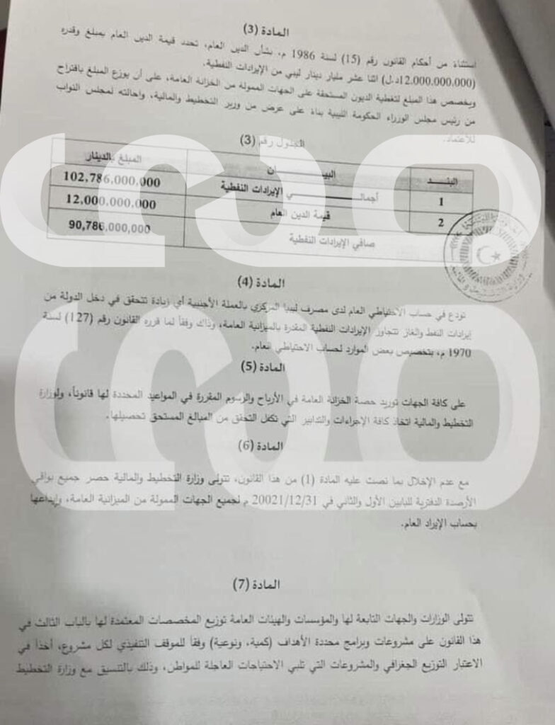 تضمنت الميزانية المعتمدة اليوم من قبل مجلس النواب والتي تحصلت صدى الاقتصادية حصرياً عليها الإيرادات المتوقع تحصيلها خلال السنة المالية 2022 حسب مشروع ميزانية الحكومة الليبية، حيث بلغ صافي إيرادات الموارد النفطية التي يتوقع تحقيقها 90,786,000,000 مليار دينار.