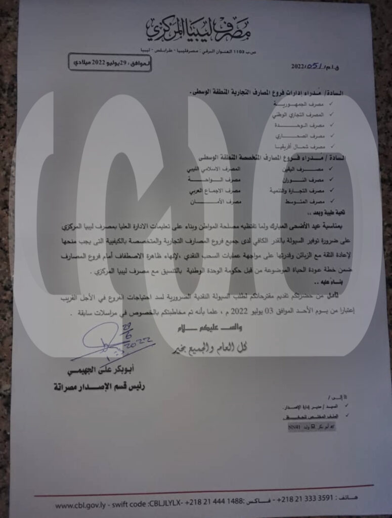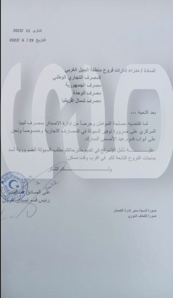 تحصلت صحيفة صدى الاقتصادية حصرياً لمراسلة رئيس اصدار غريان بمصرف ليبيا المركزي إلى مدراء إدارات فروع المصارف بمنطقة الجبل الغربي لتقديم مقترحاتهم بطلب السيولة لسد حاجات الفروع .
