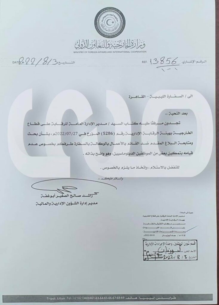 تحصلت صحيفة صدى الاقتصادية على مراسلة وزارة الخارجية بحكومة الوحدة الوطنية إلى السفارة الليبية بالقاهرة بخصوص عدم تمكين القائم بالأعمال بالوكالة بالسفارة للمكتب الصحي الجديد الذي تم تكليفه بالسفارة.