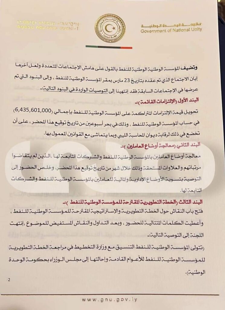 حيث نص القرار بالبند الأول والإلتزامات القائمة بتحويل قيمة الإلتزامات المتراكمة على المؤسسة الوطنية للنفط بإجمالي ( 6,435,601,000 ) في حساب المؤسسة الوطنية للنفط ، وذلك في بحر أسبوعين من تاريخ توقيع هذا المحضر على أن تخضع في ذلك لرقابة ديوان المحاسبة الليبي وبما يتماشى مع القوانين المعمول بها، وكذلك في البند الثاني معالجة أوضاع العاملين بالمؤسسة الوطنية للنفط والشركات التابعة لهـا الـذيـن لـم يتقاضوا مرتباتهم والعلاوات المستحقة، وذلك خلال شهر من تاريخ توقيع هذا المحضـر، بالإضافة إلى تسوية الأوضاع الإدارية والمالية للعاملين بالمؤسسة الوطنية للنفط والشركات التابعة لها .