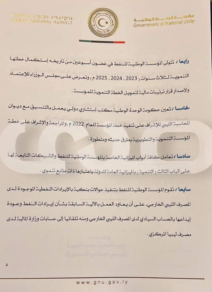 وفي الختام على المؤسسة الوطنية للنفط أن تتولى في غضون أسبوعين من تاريخـه إستكمال خطتها التنموية لثلاث سنوات ( 2023 ، 2024 ، 2025 م ) وتعـرض على مـجلس الوزراء للإعتماد ولإصدار قرار ترتيبات مالية لتمويل الخطة التنموية للمؤسسة، وكذلك تعين حكومة الوحدة الوطنية مكتب إستشاري دولـي يـعمـل بالتنسيق مـع ديـوان المحاسبة الليبي للإشراف على تنفيذ خطة المؤسسة للعام 2022 م ، والمراجعة والإشراف على خطة المؤسسة التنموية والتطويرية بطرق حديثه ومتطورة، بالإضافة إلى تعامل كافة أبواب الميزانية الخاصة بالمؤسسة الوطنية للنفط والشركات التابعة لها على الباب الثالث ( التنمية بالميزانية العامة للدولة بإعتبارها ذات طابع تنموي، وتقوم المؤسسة الوطنية للنفط بتنفيذ حوالات بنكية بالإيرادات النفطية الموجودة لـدى المصرف الليبي الخارجي على أن يـعـاود العمـل بالآلية السابقة بشـأن إيرادات النفط وعـودة إيداعها بالحساب السيادي لدى المصرف الليبي الخارجي ومنه تلقائياً إلى حسابات وزارة المالية لدى مصرف ليبيا المركزي .