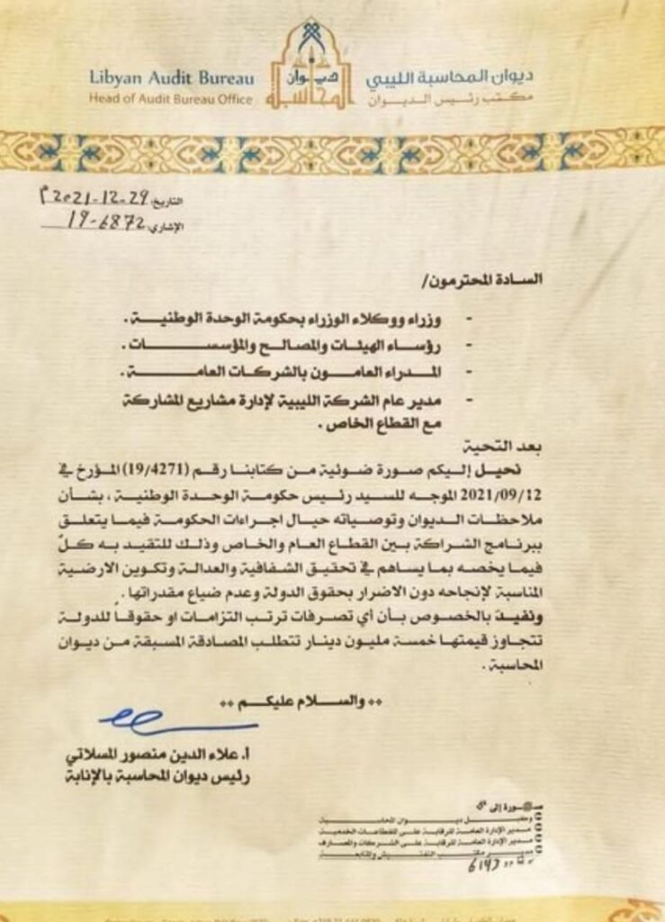 يذكر أن ديوان المحاسبة بطرابلس سبق وأوقف كافة إجراءات الشركة الليبية لإدارة مشاريع المشاركة مع القطاع الخاص (PPP) وإلزامها بعدم ترتيب أي التزامات مالية أو قانونية لا تستطيع الوفاء بها.