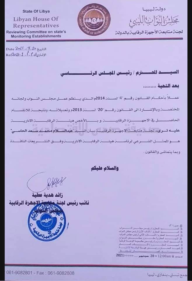 حيث تقتضي الرسالة بأن “عبدالسلام محمد سعد الحاسي” هو الممثل الشرعي لرئاسة هيئة الرقابة الإدارية وفقاً لتشريعات النافذة.