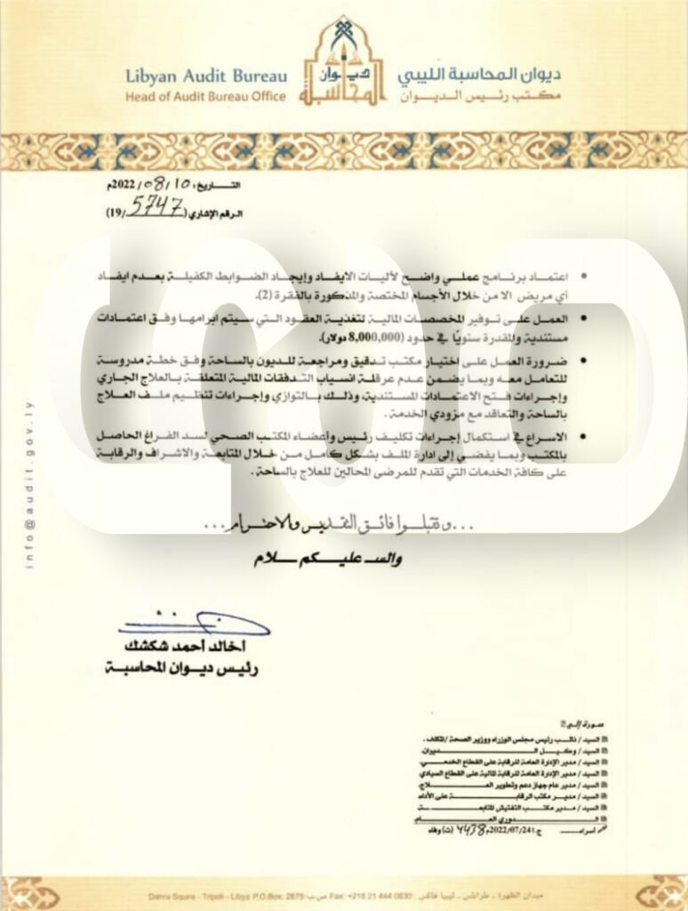 تحصلت صحيفة صدى الاقتصادية حصرياً على مراسلة ديوان المحاسبة طرابلس لرئيس مجلس الوزراء بحكومة الوحدة الوطنية ببعض الاجراءات الضرورية التي يستوجب اتخادها لتنظيم العلاج بالساحة المصرية .