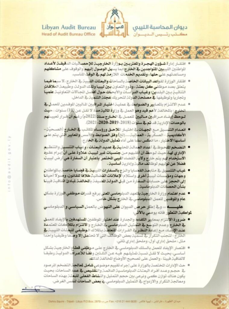 وتجاهل المتابعة الدورية لمخرجات عمل مكتب التفتيش والرقابة بوزارة الخارجية وعدم الأخـذ بملاحظاتــه الـتي مـن أهمهـا تقليص عدد البعثات الدبلوماسية والموظفين الدبلوماسيين بالخارج ، والقيام بإصدار تكليفات وتمديدات لبعض رؤساء البعثات الدبلوماسية بتعليمات شفوية خلال العام (2021م) ودون التقيد بالمدة المقررة قانونا بـ(4) سنوات، وضعف التقارير الواردة من السفارات الليبية بالخارج، حيث اقتصرت في مجملها على حضور بعض الاجتماعات والأنشطة العادية في الدولة المضيفة، ما يدل على فقدان الأهلية السياسية لجل العناصر الدبلوماسية الموفدة للعمل في الخارج.