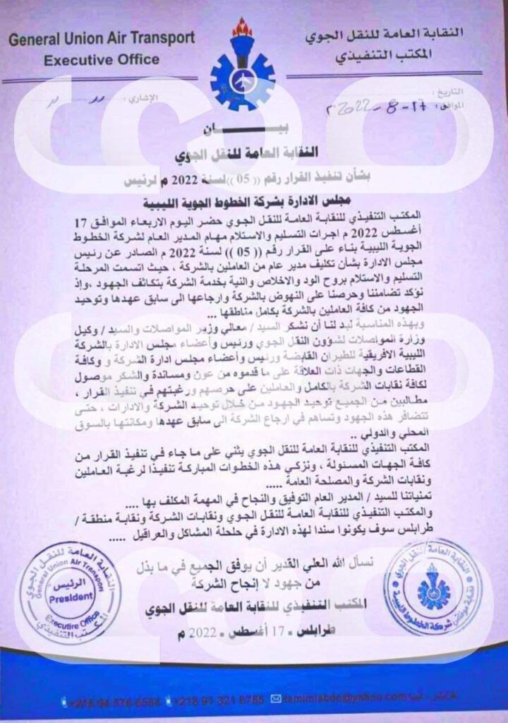 تحصلت صحيفة صدى الاقتصادية حصرياً على بيان النقابة العامة للنقل الجوي بشأن تنفيذ القرار رقم ( 05 لسنة 2022 م لرئيس مجلس الادارة بشركة الخطوط الجوية الليبية المكتب التنفيذي للنقابة العامـة للنقـل الـجـوي حـضـر اليـوم الاربعاء الموافق 17 أغسطس 2022 م.