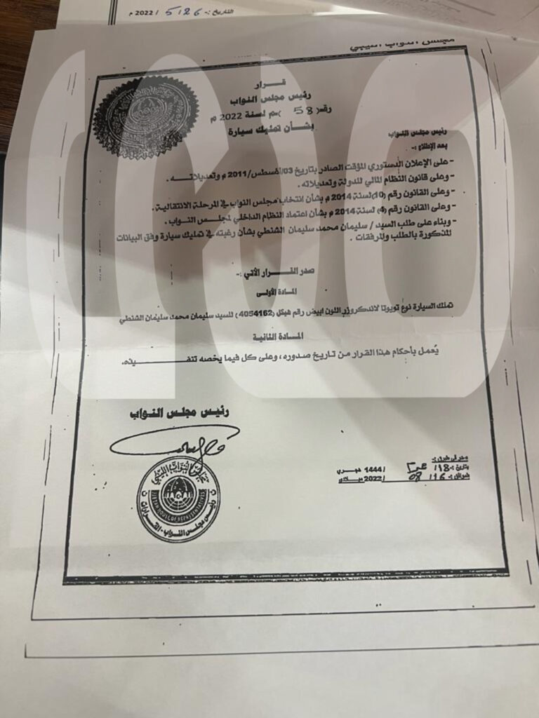تحصلت صحيفة صدى الاقتصادية حصرياً على قرار رئيس مجلس النواب “عقيلة صالح” بتمليك سيارة نوع تويوتا لاندكروزر لون أبيض لسليمان محمد الشنطي..