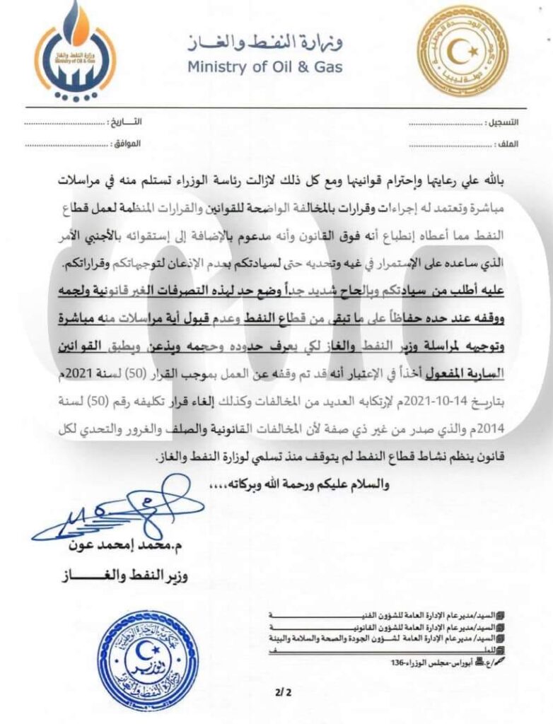 تحصلت صحيفة صدى الاقتصادية حصرياً على مراسلة وزير النفط والغاز بحكومة الوحدة الوطنية “محمد عون” إلى رئيس حكومة الوحدة الوطنية “عبد الحميد الدبيبة”، وذلك بخصوص وقف مخالفات رئيس مؤسسة النفط “مصطفى صنع الله” للقوانين والقرارات المنظمة للقطاع، وذلك لحجبه التقارير اليومية الخاصة بالإنتاج عن وزارة النفط .