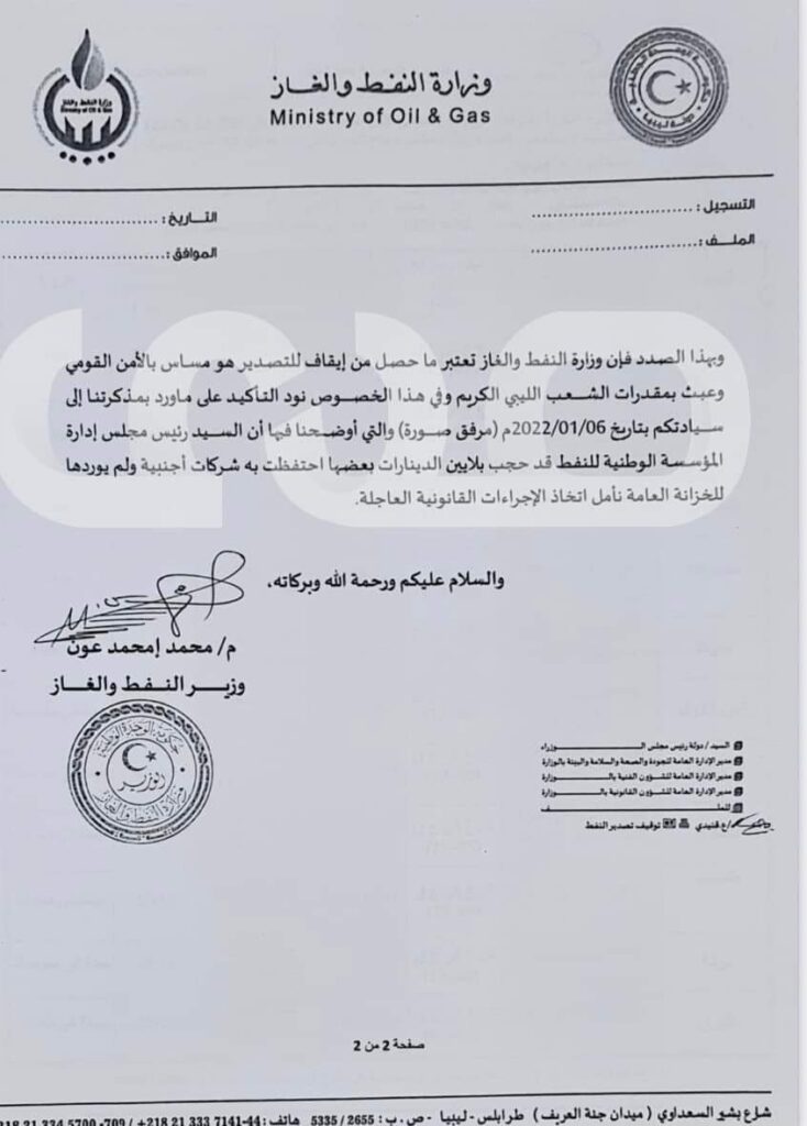 وبهذا الصدد فإن وزارة النفط والغاز تعتبر ما حصل من إيقاف للتصدير هو مساس بالأمن القومي وعبث بمقدرات الشعب الليبي وبهذا الخصوص نود التأكيد على ما ورد بمذكرتنا إلى سيادتكم بتاريخ 06/يناير/2022 والتي اوضحنا فيها بأن رئيس مجلس إدارة المؤسسة الوطنية للنفط قد حجب بلايين الدينارات بعضها احتفضت به شركات أجنبية ولم يردها للخزانة العامة نأمل منكم اتخاذ الإجراءات القانونية العاجلة.