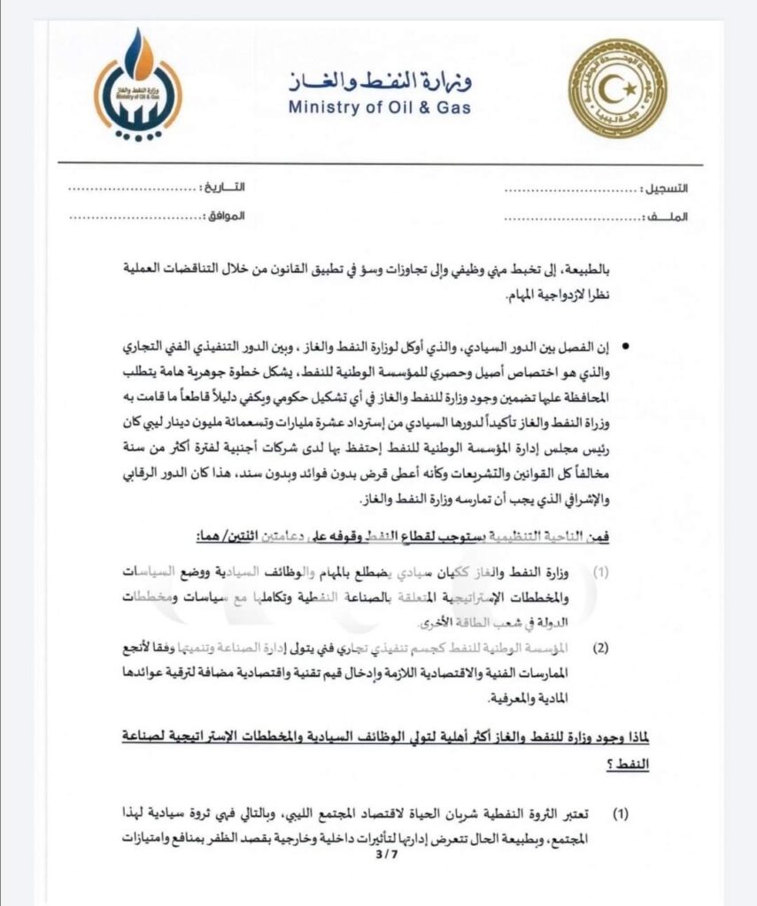 نوه “عون” خلال المراسلة كذلك إلى أن غياب الجسم السيادي وتولى المؤسسة لدور هجين، هو خليط بين الوظائف السيادية والتشغيلية والفنية والتجارية يؤدي بالممارسة إلى إحداث خلل وظيفي وقانوني من شأنه إحداث اجتهادات تؤدي بالطبيعة، إلى تخبط مهني وظيفي وإلى تجاوزات وسؤ في تطبيق القانون من خلال التناقضات العملية نظراً لازدواجية المهام، وإن الفصل بين الدور السيادي ، والذي أوكل لوزارة النفط والغاز ، وبين الدور التنفيذي الفني التجاري والذي هو اختصاص أصيل وحصري للمؤسسة الوطنية للنفط، يشكل خطوة جوهرية هامة يتطلب المحافظة عليها تضمين وجود وزارة للنفط والغاز في أي تشكيل حكومي، ويكفي دليلاً قاطعاً ما قامت به وزراة النفط والغاز تأكيداً لدورها السيادي من إسترداد عشرة مليارات وتسعمائة مليون دينار ليبي كان رئيس مجلس إدارة المؤسسة الوطنية للنفط إحتفظ بها لدى شركات أجنبية لفترة أكثر من سنة مخالفاً كل القوانين والتشريعات وكأنه أعطى قرض بدون فوائد وبدون سند، هذا كان الدور الرقابي والإشرافي الذي يجب أن تمارسه وزارة النفط والغاز .