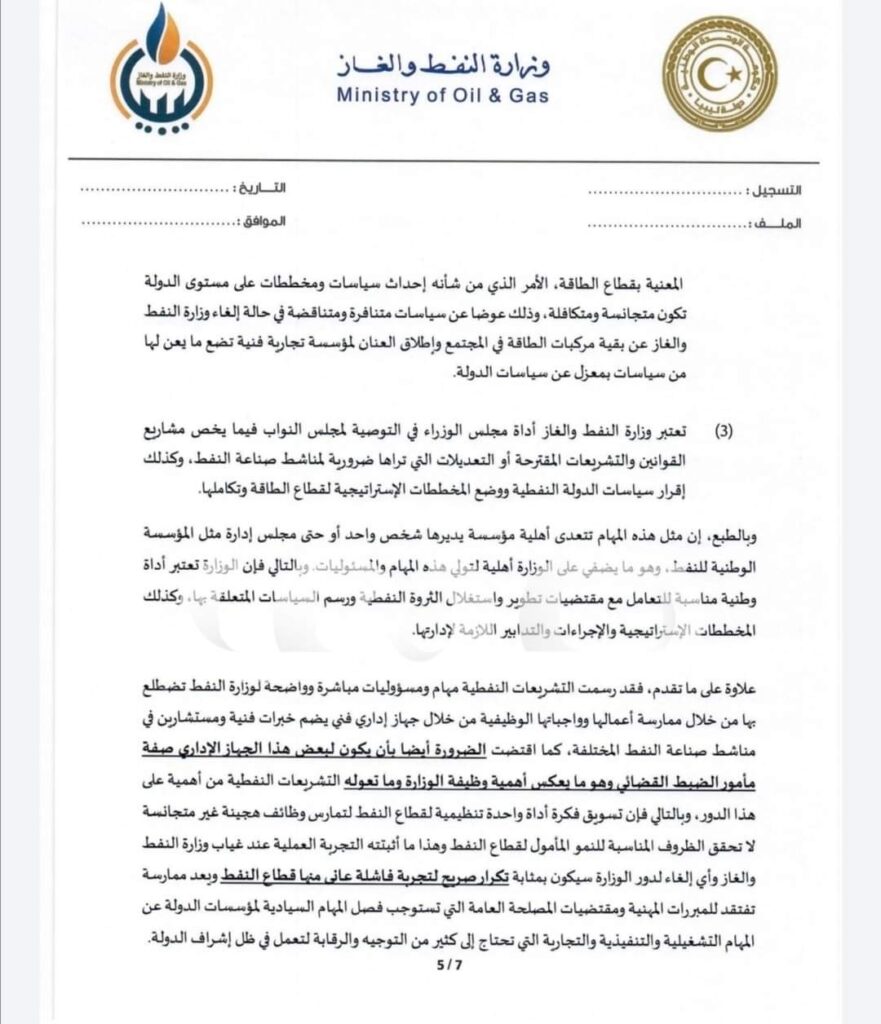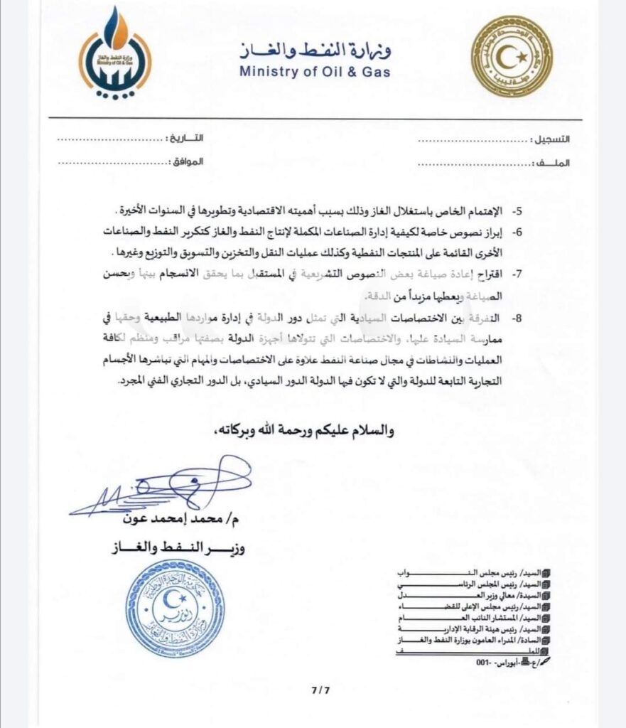 وبحسب نص المراسلة فإن وزارة النفط والغاز تمثل في التشريعات النفطية الليبية الدور السيادي الذي تمارسه الدولة على ثروتها الاقتصادية، وذلك من خلال بسط سيادتها على هذه الثروة والتأكد من حسن تنظيمها واستغلالها لضمان تحقيق عوائد وطنية كاملة غير منقوصة مع الابقاء على حق مكافأة كل المجهودات الاستثمارية والتقنية كقيم مضافة للثروة، وأنه من أهم المبادئ والقيم التي تمثلها وزارة النفط والغاز كجسم سيادي للدولة، تحقيق مكاسب وطنية قصوى من الثروة النفطية ، وذلك من خلال توظيف سياسات كفؤة لاستغلال واستنضاب المخزونات النفطية، وإيجاد خيارات ونماذج تعاقدية منصفة بقصد تطوير الحقول والاستكشافات النفطية القائمة والقدرات الكامنة، وإحداث توازن عملي بين احتياجات التنمية وحق الأجيال القادمة من الثروة النفطية وعوائدها المادية والمعرفية .