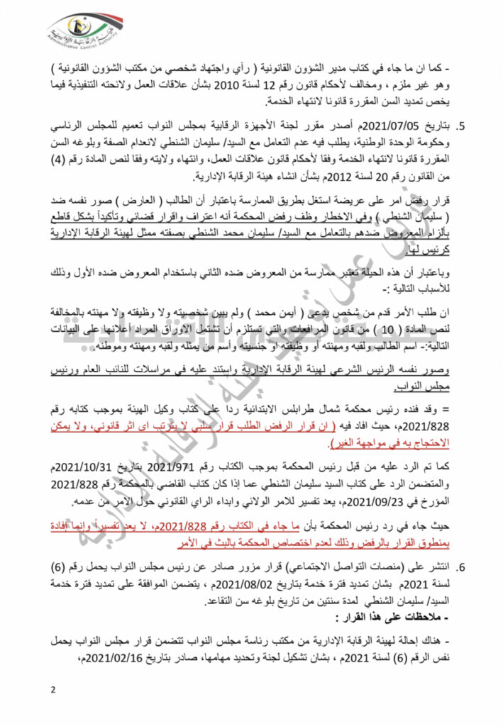 تحصلت صحيفة صدى الاقتصادية على الموقف القانوني لسليمان الشنطي بشأن رئاسة هيئة الرقابة الإدارية والذي أصدره فريق عمل توحيد هيئة الرقابة الإدارية .