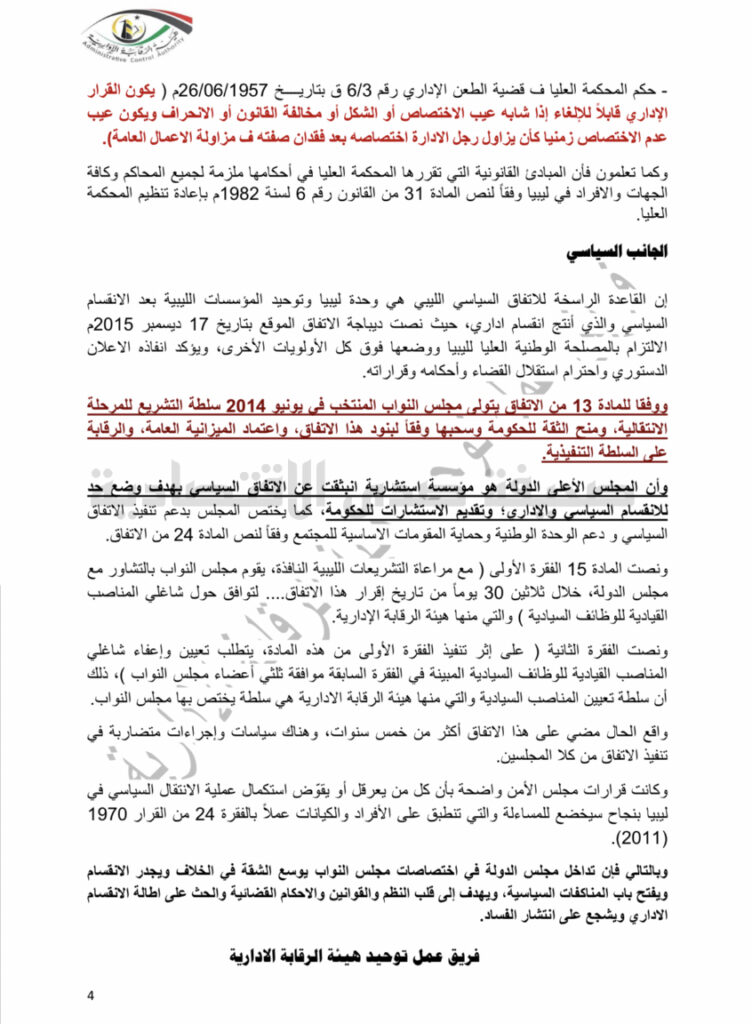 حيث أن ما ذكرته المراسلة أن “سليمان الشنطي” يعارض توحيد هيئة الرقابة الإدارية ويصدر قرارات على الرغم من إنتفاء الصفة القانونية وعدم اكتسابه للشرعية مع إشارة المذكرة إلى العديد من القرارات القانونية بالخصوص وأن تدخل المجلس الأعلى للدولة في اختصاصات مجلس النواب يوسع الشقة في الخلاف.