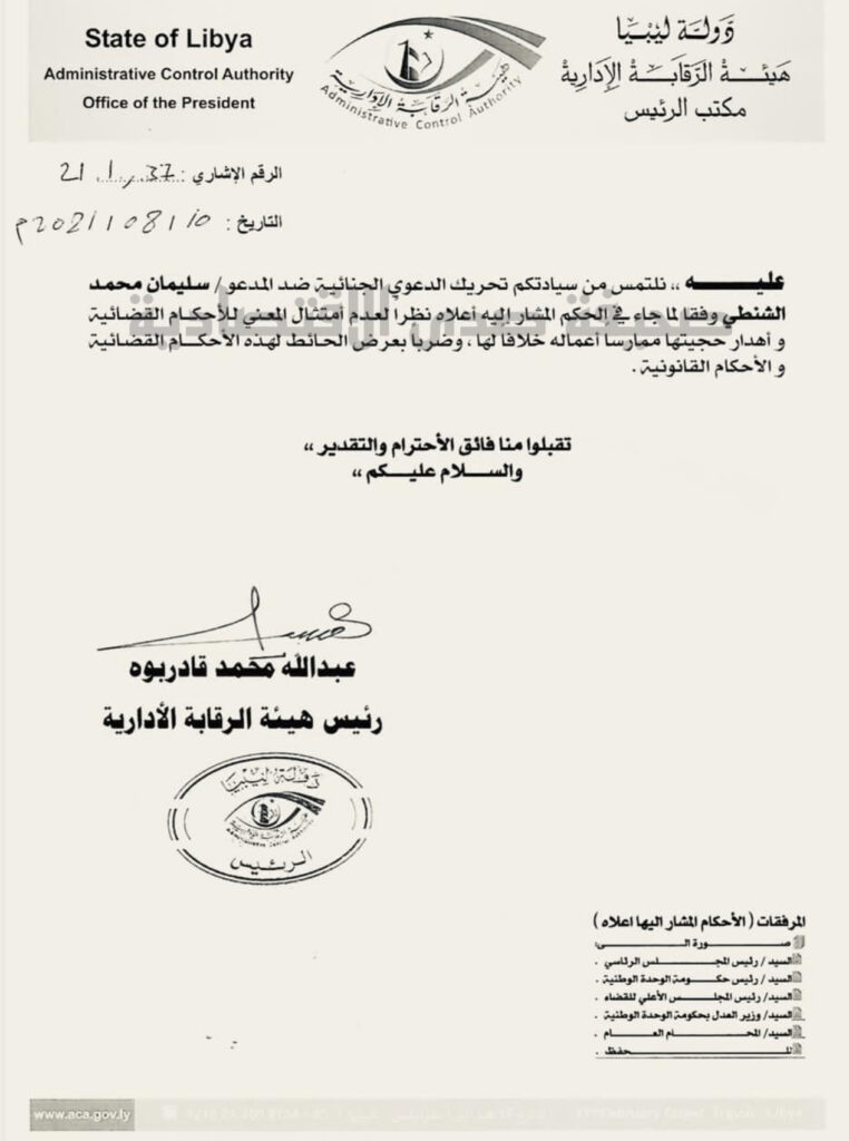 تحصلت صحيفة صدى الاقتصادية على مراسلة رئيس هيئة الرقابة الإدارية بطرابلس عبد الله قادربوه إلى النائب العام تفيد بمطالبته تحريك الدعوى الجنائية ضد رئيس الهيئة بطرابلس سليمان الشنطي .