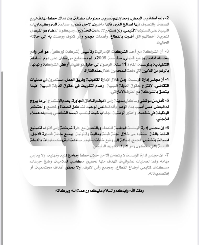 2- رغم أكاذيب البعض، ومحاولتهم تسريب معلومات مضللة، بأن هناك خطط تهدف لبيع المصفاة، والتصرف فيها لصالح الغير، فإننا ماضون، لإجل تطوير صناعة البتروكيماويات الليبية على المستوى الإقليمي، ولن نستمع لادعاءات المخذولين، وسيكون القضاء هو الفيصل لتعرية أخطائهم التي أضرت بالقطاع، وأهملت مجمع رأس لانوف ووصلت به إلى حالته الحالية.