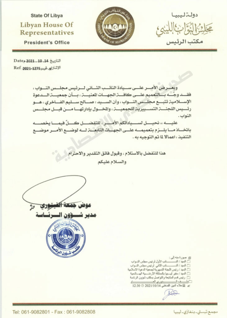 تحصلت صحيفة صدى الاقتصادية على مراسلة مدير شؤون رئاسة مجلس النواب إلى عدد من الجهات والتي تقضي بأن جمعية الدعوة الإسلامية تتبع مجلس النواب والمخول بإداراتها هو “صالح الفاخري”.