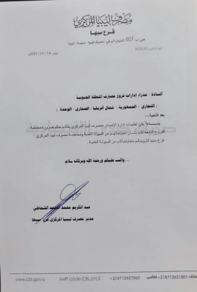 كما راسل مدير مصرف ليبيا المركزي فرع سبها مدراء فروع المصارف بالمنطقة الجنوبية وذلك بضرورة مخاطبة الفروع التابعة لهم بشأن احتياجاتهم من السيولة النقدية ومخاطبة مصرف ليبيا المركزي فرع سبها لتزويدهم بإحتياجاتهم من السيولة النقدية وذلك بناءاً على تعليمات إدارة الإصدار بمصرف ليبيا المركزي .