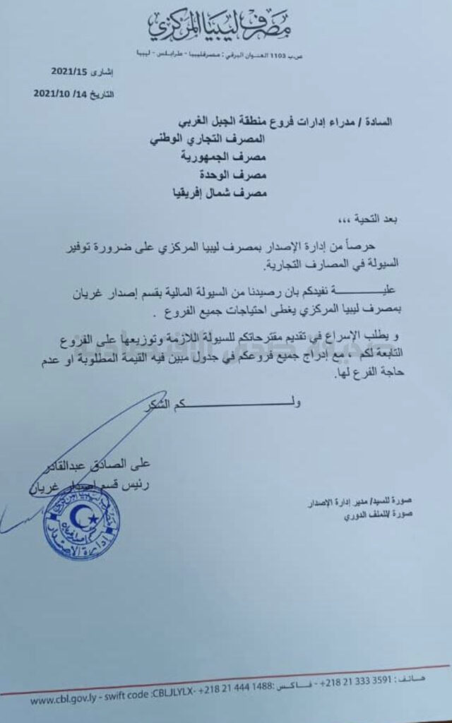 من جهته خاطب رئيس قسم الاصدار مصراتة بمصرف ليبيا المركزي المصارف التجارية وذلك لتقديم مقترحاتهم لطلب السيولة النقدية الضرورية لسد احتياجات الفروع في الأجل القريب اعتباراً من يوم الخميس 14 أكتوبر .