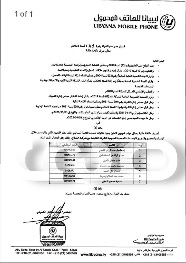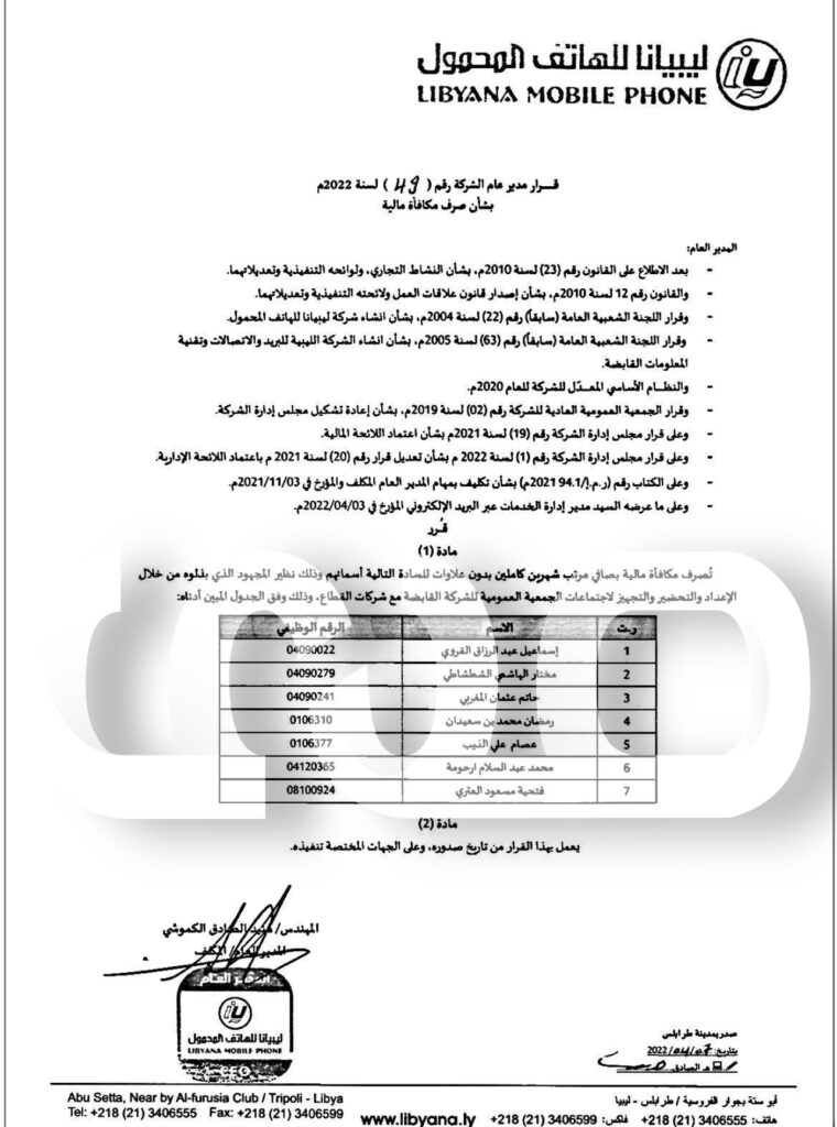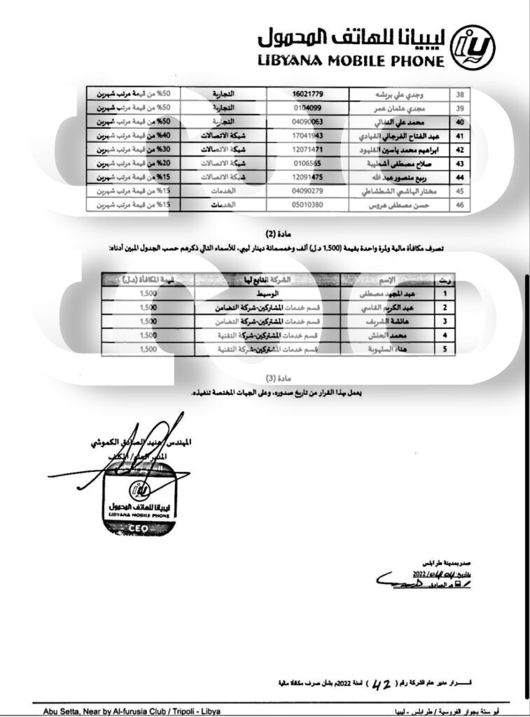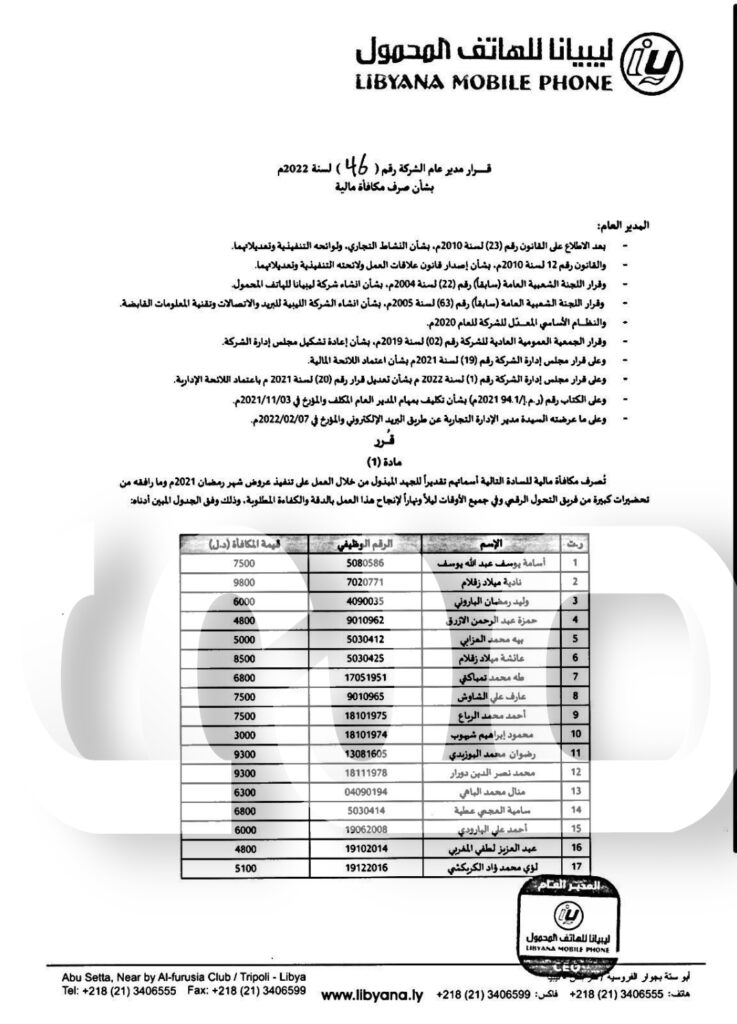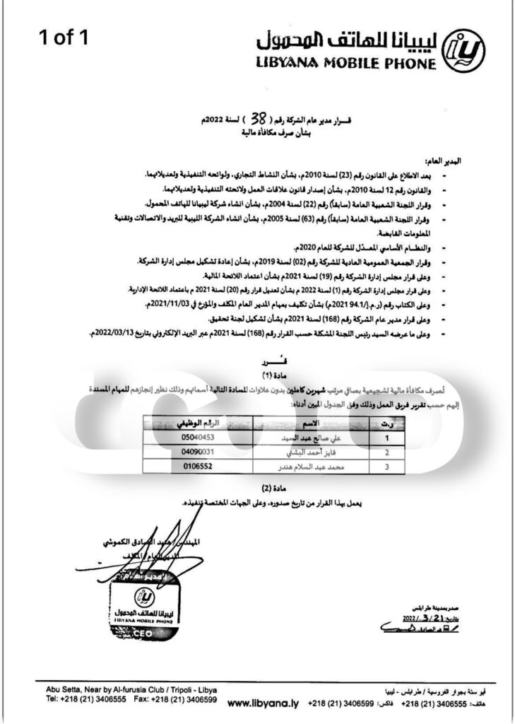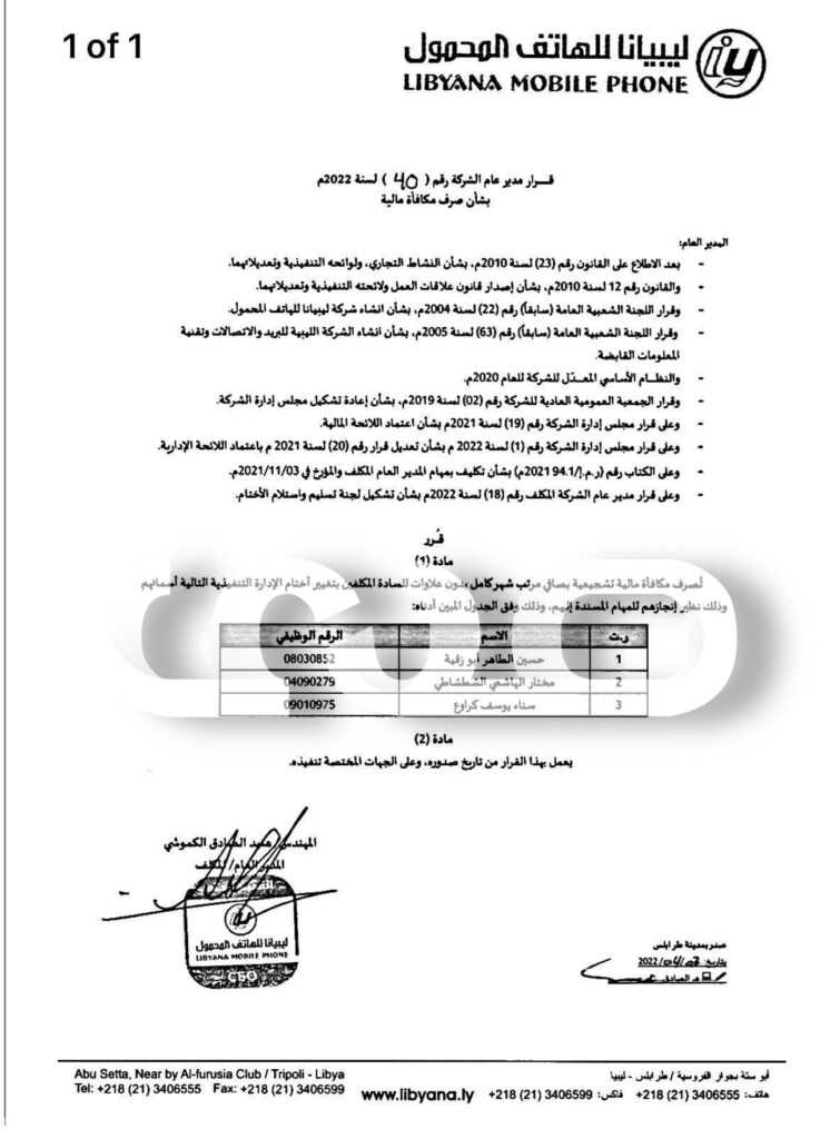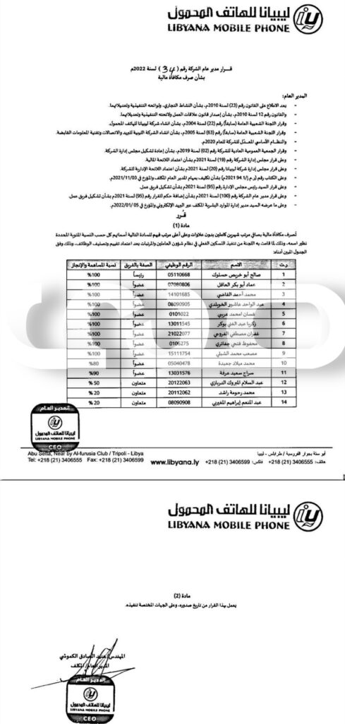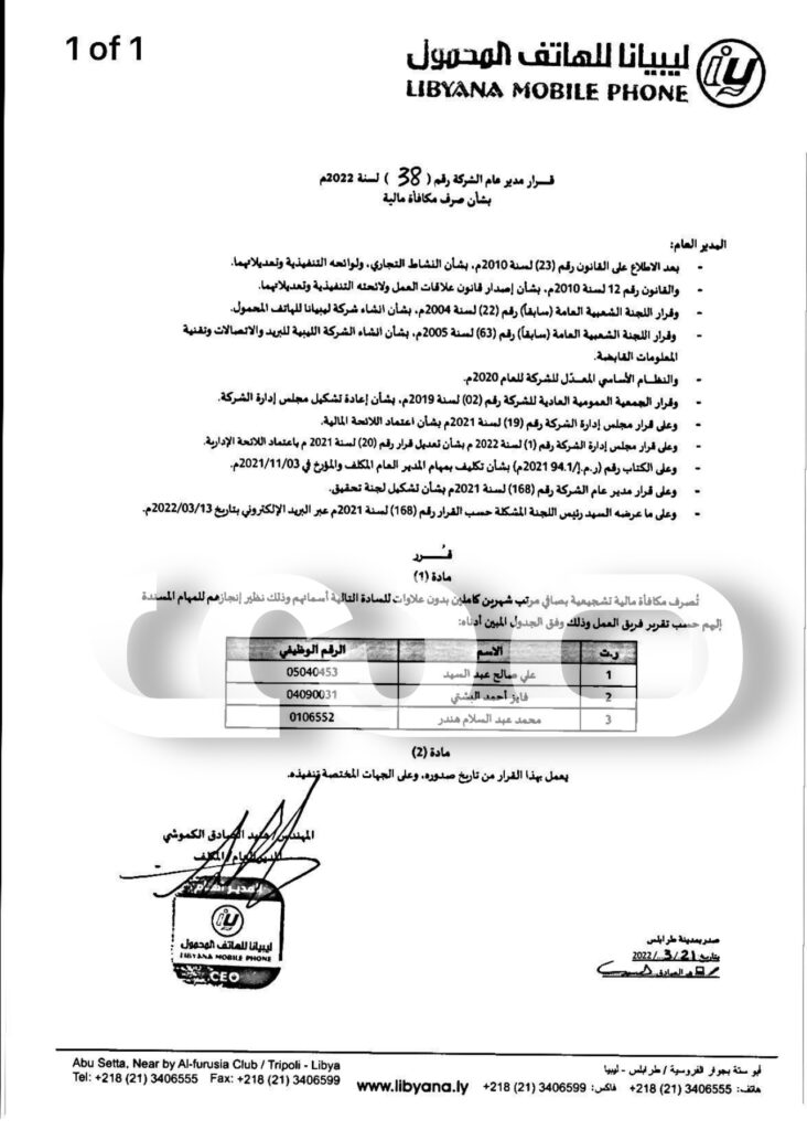 تحصلت صحيفة صدى الاقتصادية حصرياً على قرارات تثبت قيام المدير العام لشركة ليبيانا المكلف من قبل رئيس مجلس الإدارة محمد بن عياد بصرف مكافآت لموظفين تصل إلى مليون و 400 ألف دينار لأسماء متكرره في القرارات .