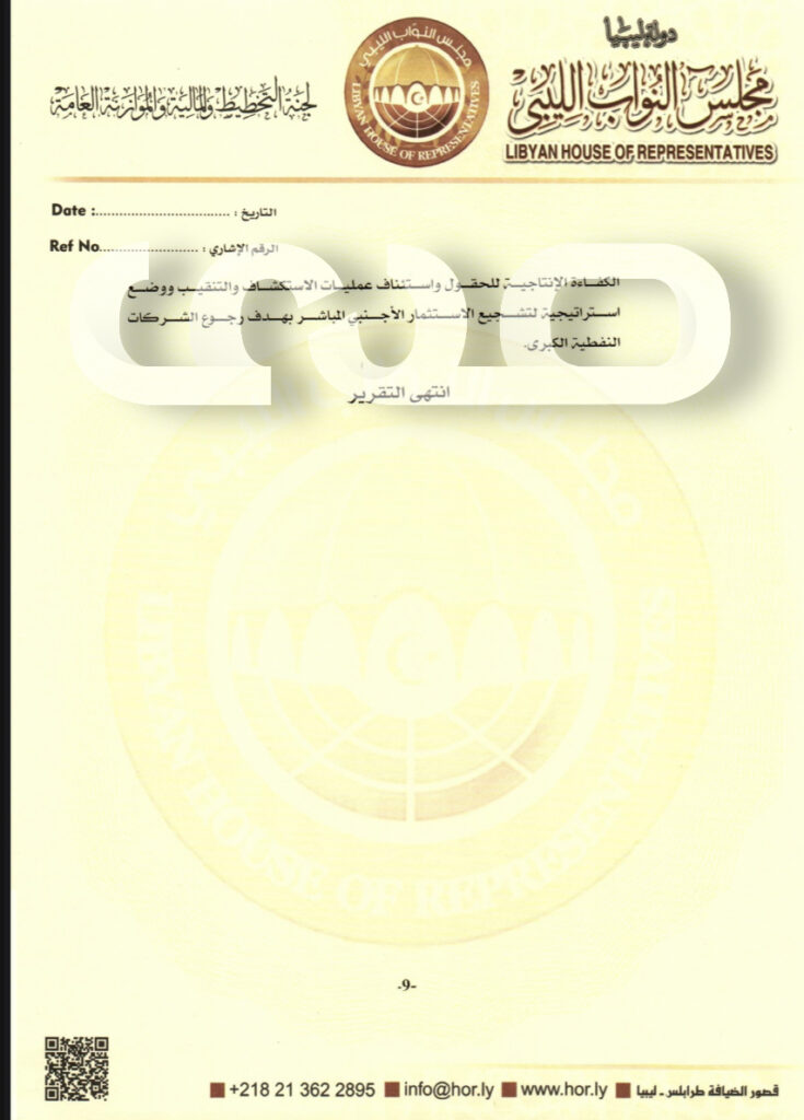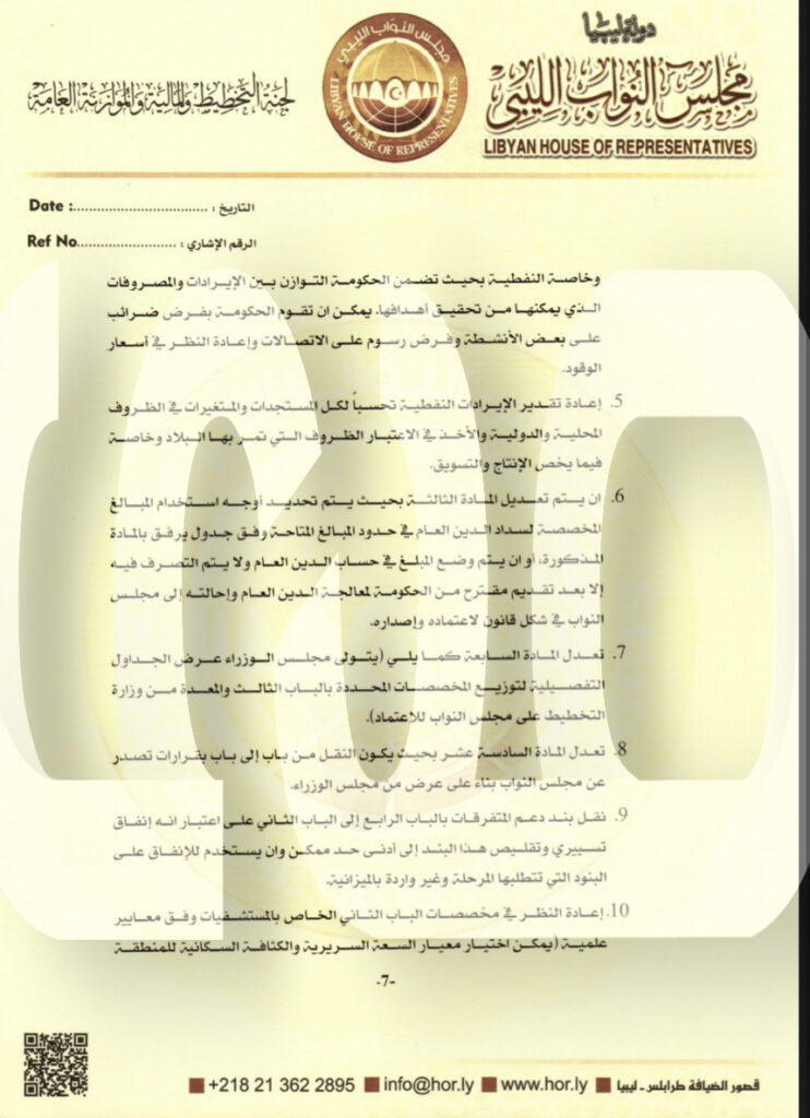 ومراجعـة بعض المخصصات لبعض الجهات بالباب الثـاني والـتـي بـهـا الحـراف كبير مقارنة بالنفقات الفعلية للسنة المالية الماضية والاهتمام بميزانية البرنامج الوطني لتطـوير قطـاع الـنفط وان تكون أولويات قطاع النفط متمثلة في المحافظة على المستويات الحالية للإنتاج في الوقـت الحـالـي ومـن ثـم العـمـل عـلـى الـرفـع مـن القـدرة الإنتاجيـة مـن خـلال رفـع الكفـاءة الإنتاجية للحقـول واستئناف عمليات الاستكشاف والتنقيـب ووضـع استراتيجية لتشجيع الاستثمار الأجنبي المباشـر بهـدف رجـوع الشـركات النفطية الكبرى.
