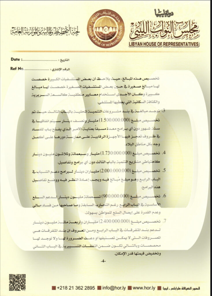 وتخصيص مبالغ كبيرة لبعض الجهـات بالبـاب الـثـاني مقارنة بالنفقـات الفعلية للسنة المالية الماضية منها على سبيل المثال: المركـز الإعلامـي اللـيبي للدراسات والاستراتيجيات والاستشارات خصص له 60.000.000 دينار باب ثاني ، ومركـز الرقابـة علـى الأغذية والأدويـة خصص لـه 80.000.000 دينار باب ثاني .