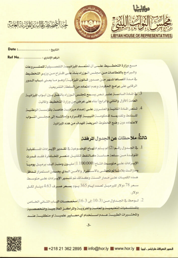 كما تنص المادة الثانية والعشرون علـى إعـداد ميزانية خاصة بالمؤسسة الوطنية للنفط وتقديمـه للحكومة الليبيـة لإقراره وإحالته إلى مجلـس النـواب لاعتماده دون وضع الخطوط العريضة للهدف من هذه الميزانية ثالثاً: ملاحظات عن الجدول المرفقة حيث أنه الجـدول رقم (2) لم يتم انتهـاج الموضوعية في تقدير الإيرادات المستقبلية المتولدة من سلعة حساسة كالنفط لتقليـل عنصر المخاطرة فقد قدرت الإيرادات علـى متوسط انتـاج (1.100.000) مليون ومئة ألف برميل يومياً ومازالت بلادنا لم تحظى بالاستقرار والأمـن الـذي يضمن استمرار تدفق هذه الكميات على مدار السنة، وكذلك تم تقدير الإيرادات على متوسط سعر 78 دولار للبرميـل لعـدد أيام 365 يـوم بسعر صرف 4.63 دينـار لـكـل دولار ، كما لوحظ الجـداول مـن (3-10 إلى 3-16) مخصصـات البـاب الـثـانـي الخـاص بالمستشفيات التعليمية والعامة والقروية والمراكز العلاجية والتخصصية والمختبرات الطبيـة عـدم اسـتخدام أي معايير علميـة أو منطقيـة عنـد تخصيص هـذه المبالغ، حيـث يلاحظ أن بعض المستشفيات الكبيرة خصصـت لهـا مبالغ صغيرة في حين بعـض المستشفيات الصغيرة خصصت لهـا مـبـالغ كبيرة وكـان الأجـى اســتخدام معايير منطقيـة كا سريرية والكثافة السكانية التي يغطيها المستشفى.