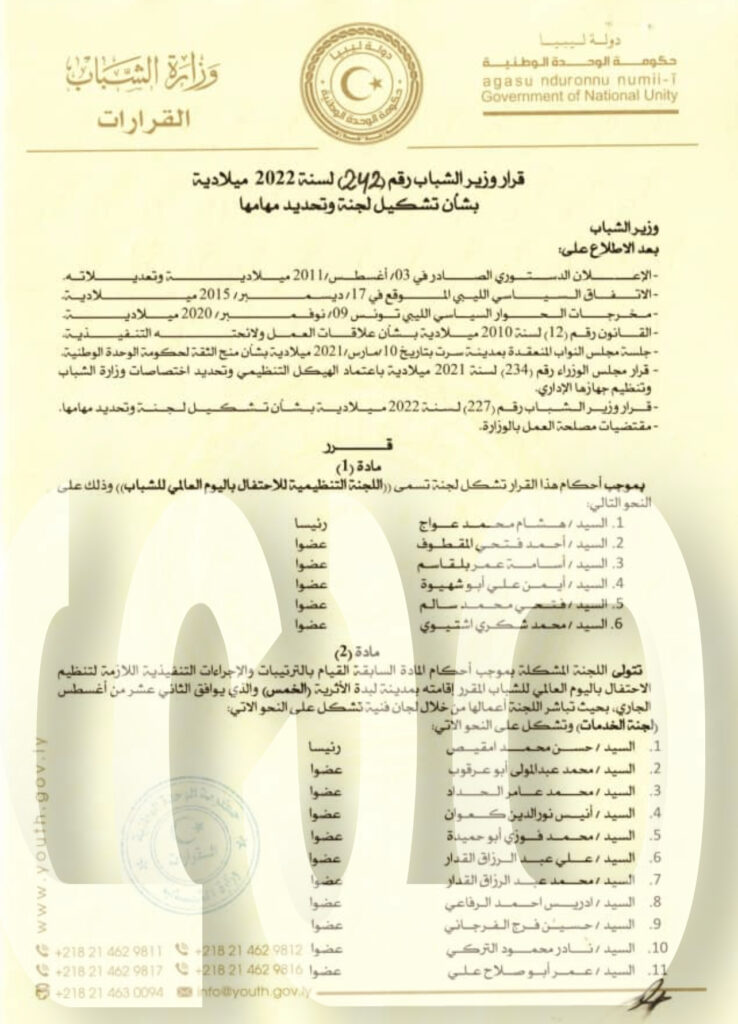 قرر وزير الشباب بحكومة الوحدة الوطنية في قرار تحصلت صدى الاقتصادية حصرياً عليه تشكيل لجان بمناسبة قرب اليوم العالمي للشباب وذلك بلبدة بمدينة الخمس والذي يوافق يوم 12 أغسطس.