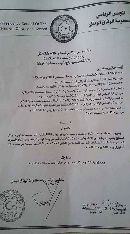 المجلس الرئاسي بحكومة الوفاق يخصص مبلغ 5 ملايين دينار لحل مشاكل المياه والصرف الصحي بمدينة البيضاء ،حيث صدر قرار المجلس الرئاسي رقم 743 لسنة 2017 بشأن منح مدينة البيضاء مبلغ مالي من أجل حل مشاكل المياه والصرف الصحي بالمدينة وكذلك الصيانه العاجلة بها .