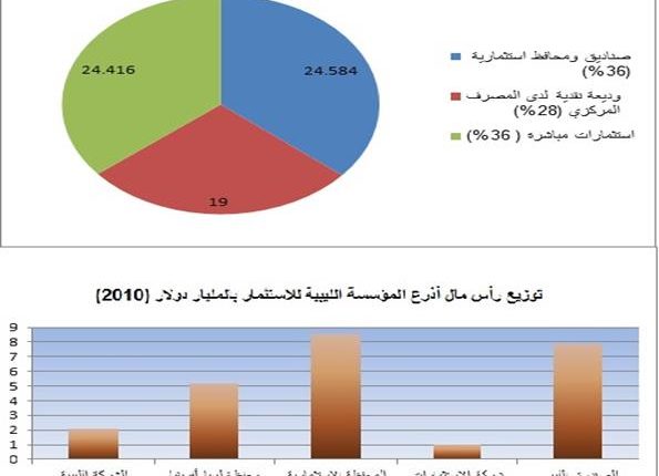 وفيما يخص الاستثمارات الخارجية الليبية والتي تتجاوز قيمتها 200 مليار دولار فهي تتم إجمالاً عبر أكثر من جهة، لعل أبرزها على الإطلاق: مصرف ليبيا المركزي وذراعه المصرف الليبي الخارجي(LFB)، والصندوق السيادي الليبي المعروف بأسم المؤسسة الليبية للاستثمار (LIA)، وفي حقيقة الأمر فإن المعلومات عن المؤسسة الليبية للاستثمار وأصولها شحيحة، وهي إما منشورة ضمن التقارير السنوية لديوان المحاسبة، أو أنها في صورة مقالات صحفية قليلة العدد منشورة على شبكة المعلومات الدولية الإنترنت، والمؤسسة الليبية للاستثمار أنشأت بالقرار رقم 208 لعام 2006 والذي تم تعديله بالقرار 104 لعام 2008، ليعاد تنظيمها بالقانون رقم 13 لسنة 2010 وبهدف إدارة الفائض من إيرادات النفط الليبية، وهي تدير أكثر من 35 % من إجمالي الأصول والمساهمات الليبية بالداخل والخارج، وذلك عبر 5 أذرع هي: المحفظة الاستثمارية طويلة الاجل (LTIP) والتي أنشأت بالقرار رقم (767) لسنة 1991 وهي محفظة استثمارية تجارية لغرض الاستثمار طويل الأجل، والشركة الليبية للاستثمارات الخارجية (لافيكو LAFICO) والتي أنشأت بموجب القرار رقم (1198) لسنة 1981، وهي أعرق وأنشط الشركات الاستثمارية الليبية، والقابضة للاستثمارات النفطية (أويل انفستOIL INVEST) والتي تأسست في العام 1988 وكانت تملكها المؤسسة الوطنية للنفط وبمساهمة لافيكو والمصرف الليبي الخارجي، ومحفظة ليبيا افريقيا للاستثمار (لايبLAIP) والتي أنشأت بالقرار رقم (15) لسنة 2006 وهي تدير أصول واستثمارات معتبرة في القارة الأفريقية، والصندوق الليبي للاستثمار الداخلى والتنمية (LLIDF) والذي أنشأ بالقرار رقم (107) لسنة 2009 كذراع استثماري وتنموي في داخل ليبيا، وبحسب قرار إنشائه فإنه يهدف إلي العمل على تحسين البنية التحتية للبلد بهدف تمهيد الطريق للقطاع الخاص للمشاركة الفاعلة والواسعة في الأنشطة الاقتصادية.
