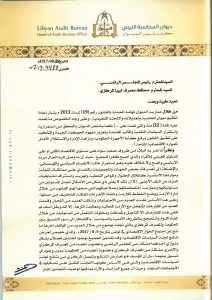 وقد وجه السيد رئيس ديوان المحاسبة الليبي الى السيد رئيس المجلس الرئاسي ، والسيد محافظ مصرف ليبيا المركزي خلال هذا الكتاب تنبيه حول ضرورة التنسيق فيما بينها والعمل الجاد لاختيار البديل المناسب للخروج من الازمة ووضع الخطة الملائمة لتنفيذه، منوها إلى أن عدم إتخاذ قرار في هذه الفترة هو في حد ذاته قرار لإستمرار الازمة.