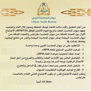 عقد صباح اليوم الاجتماع الاول بين اللجنة المشكلة من ديوان المحاسبة طرابلس واللجنة المشكلة من ديوان المحاسبة البيضاء بمقر ديوان المحاسبة البيضاء وتم خلال الاجتماع التأكيد على ان ديوان المحاسبة الليبي يعمل بصورة موحدة ، بالإضافة إلى الاتفاق على توحيد التقرير السنوي للعام 2018م و اعداد خطة تشغيلية موحدة للعام 2019م، كذلك التواصل المباشر بين الادارات العامة والمكاتب والفروع من أجل انجاز الاعمال الرقابية بوجه السرعة وبسبل رشيدة و تشكيل لجان فحص ومراجعة مشتركة في الداخل والخارج و اقتراح توحيد الهيكلية التنظيمية للديوان.