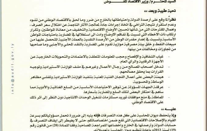 خاطب ديوان المحاسبة الليبي رئيس المجلس الرئاسي و محافظ مصرف ليبيا المركزي و وزير الاقتصاد المفوض ، بشأن ما وقع على أرصدة الدولة و إحتياطاتها في الخارج من ضرر و ما لحق بالاقتصاد الوطني من تشوه و عدم استقرار .