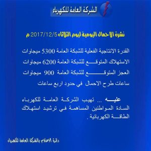 الشركة قدرت قدرة التوليد اليوم بحوالي 5300 ميجاوات مضيفة ان الاستهلاك المتوقع اليوم سيكون في حدود 6200 ، وبعجز يبلغ 900 ميجاوات، وأن الطرح سيكون في حدود 4 ساعات .