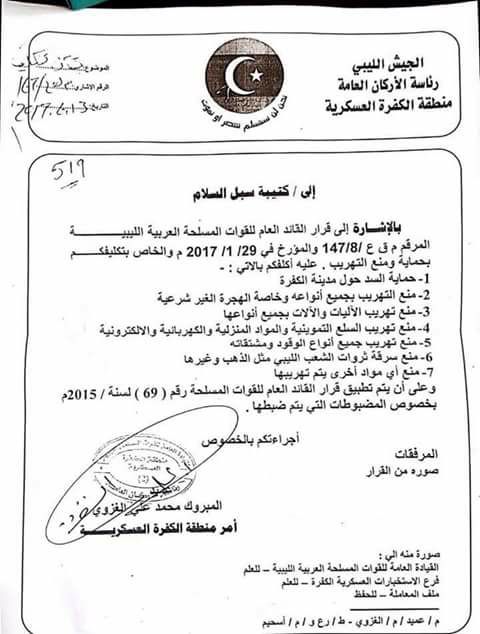 كتيبة سبل السلام تبدأ تطبيق مكافحة ومنع التهريب حسب القرار الصادر إليها حيث أعلنت الكتيبة عبر الصفحة الرسمية لها بأنه سيتم البدء في تطبيق إيقاف الحركة عبر الحدود و منع التهريب بجميع اشكاله ومنع خروج السيارات والشاحنات والآلات الثقيلة والأجهزة والسلع التموينية والغذائية وغيرها و تهريبها إلى دول الجوار ، ابتداء من فجر الأربعاء القادم الموافق 5_7_2017 .